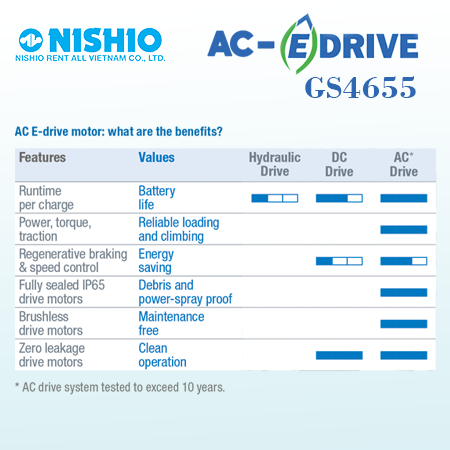 国内最大の作業高16m(作業床高14m)のコンパクトバッテリーシザーリフトGS4655を導入しました。走行モーターには、最新のAC E Drive(AC電動モーター)を搭載し、従来の油圧走行モータータイプより油漏れリスクの軽減、充電後の使用時間も30%伸びます。