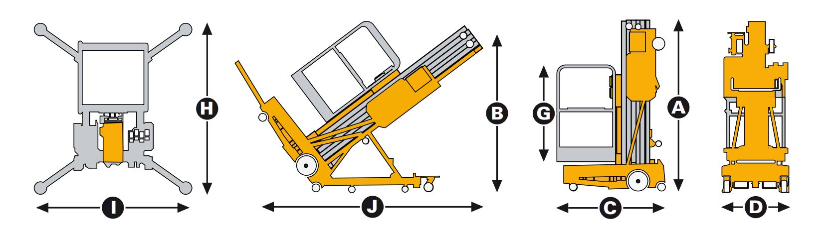 - Push-around mechanism: The user can manually push the lift to the desired working location, then elevate the platform electrically.
