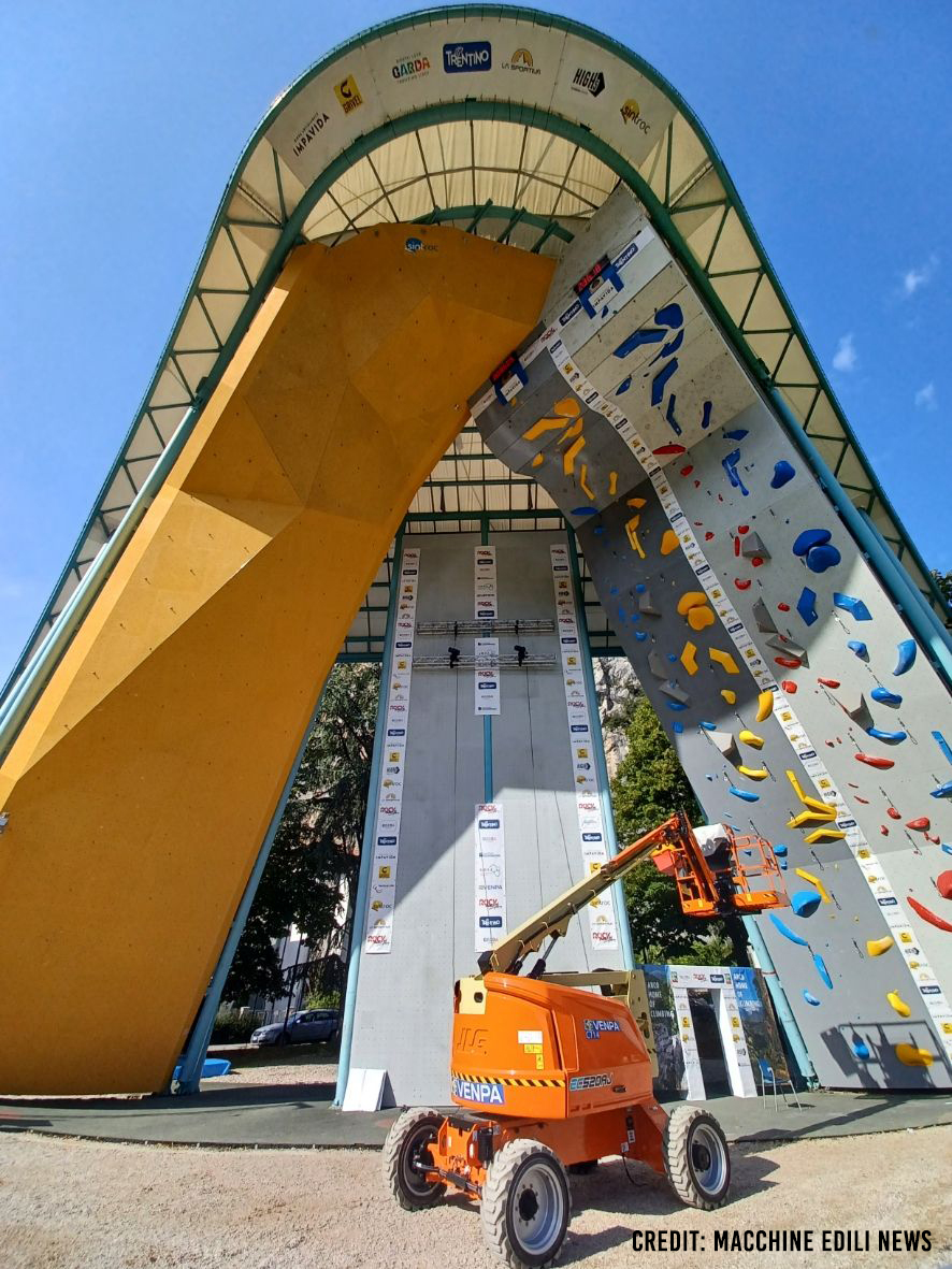Image: The Boom Lift EC520AJ supporting the installation of an 18-meter artificial climbing wall at the Rock Master Festival in Arco, Italy (Credit: Macchine Edili News)