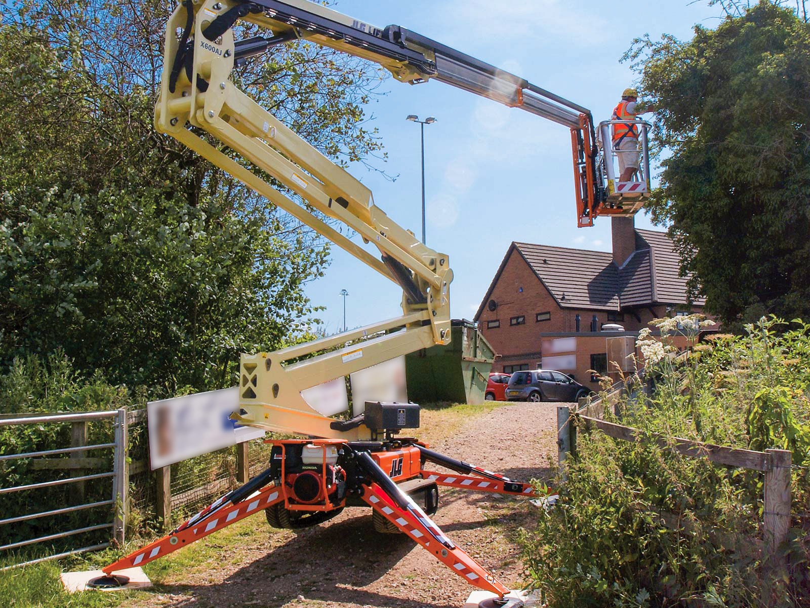 - Used for construction projects in narrow areas or sloped terrain where traditional boom lifts cannot operate.