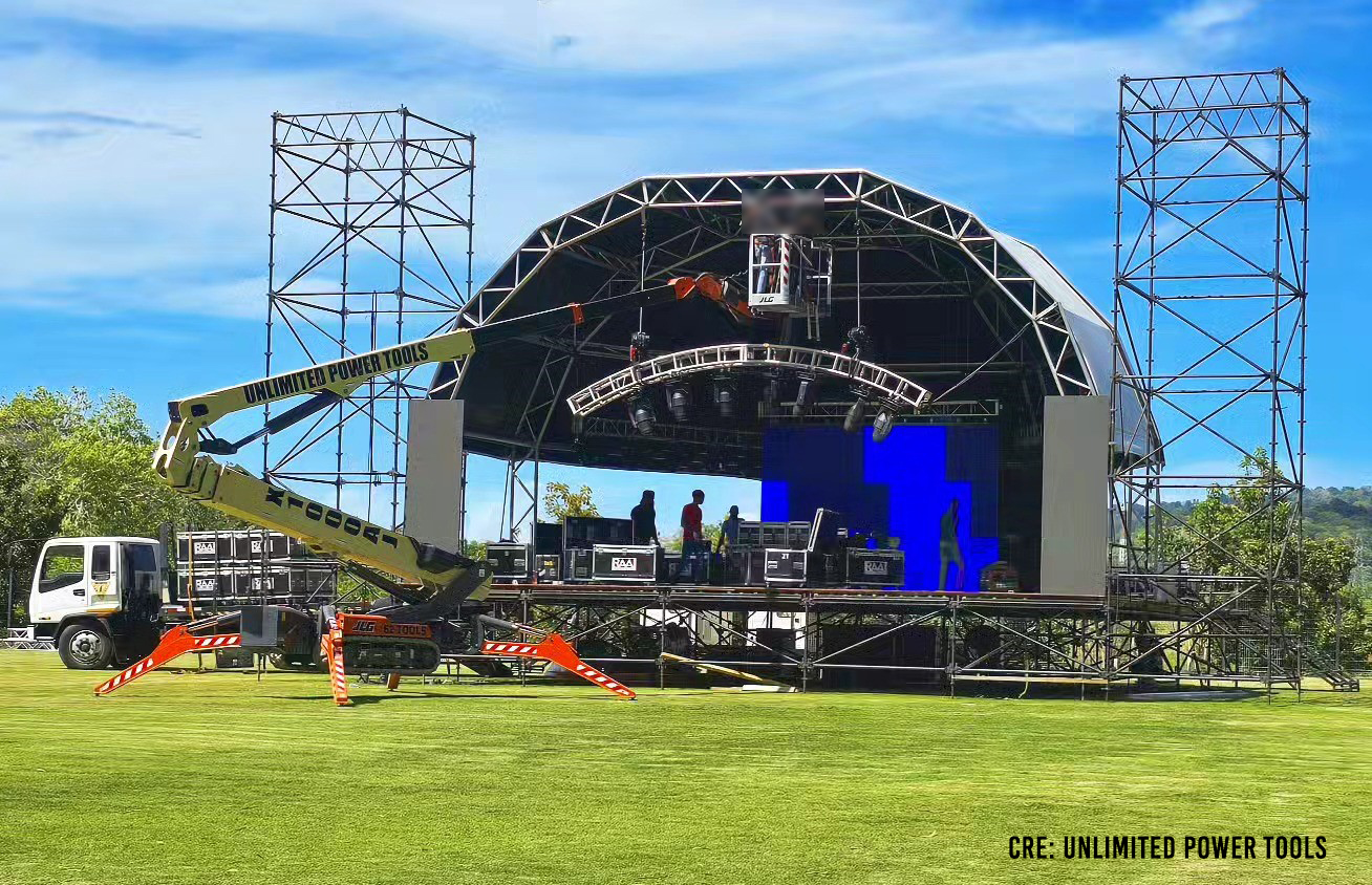Image: Using Compact Crawler Boom Lift X1000AJ (X33JP) for setting up the stage of an outdoor event (Credit: Unlimited Power Tools)