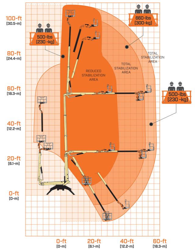 Working Range of JLG Compact Crawler Boom Lift X33JP