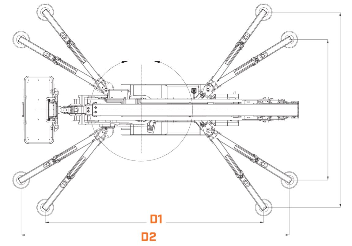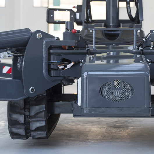 - Bánh xích xó thể mở rộng để tăng độ ổn định khi di chuyển trên nền dốc và thu hẹp lại để dễ dàng đi qua cửa ra vào hoặc lối đi hẹp.