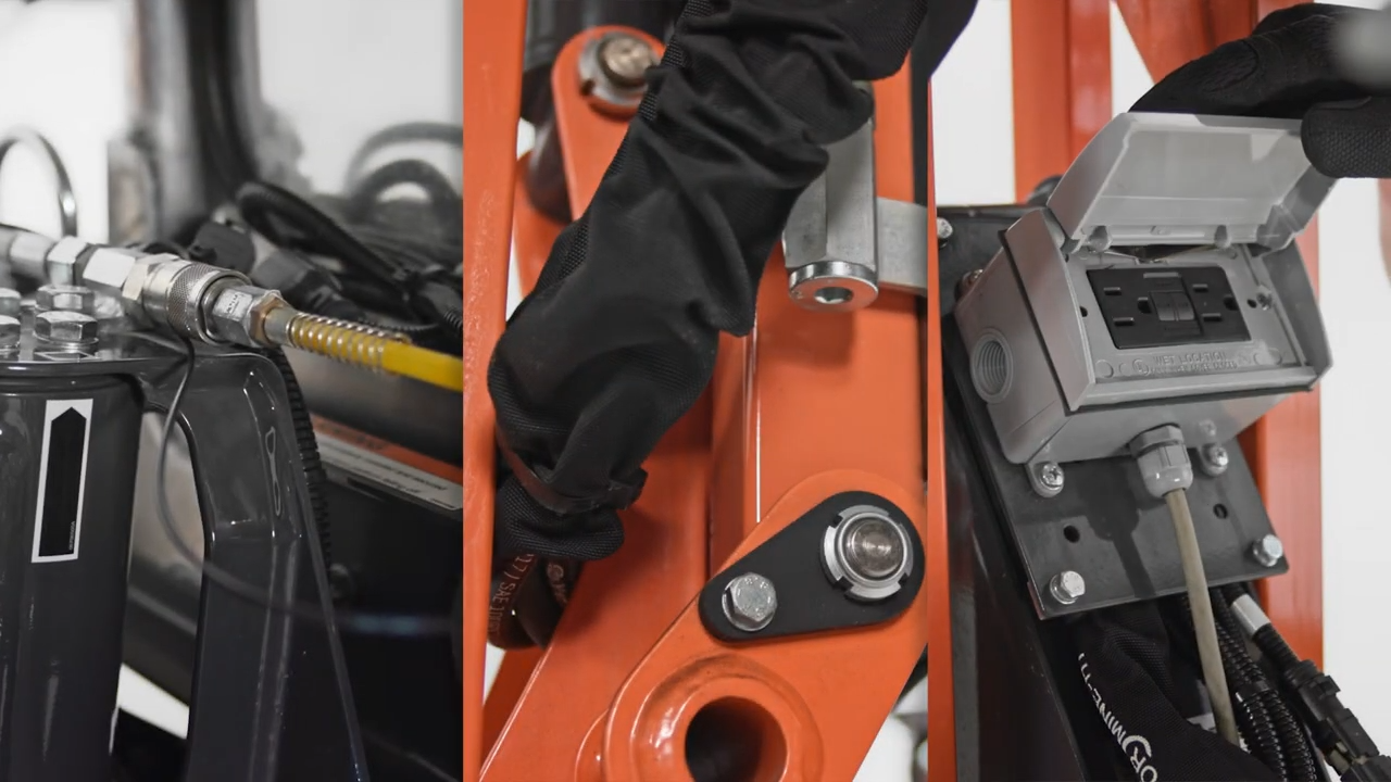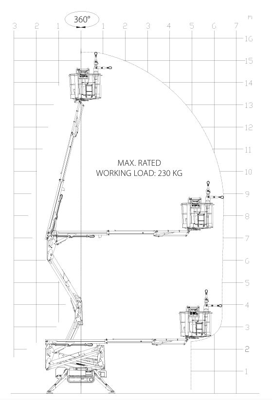 - Thiết kế cần gập khớp nối, cần xe xoay (không liên tục) 360° và sàn xe xoay 124°, hỗ trợ làm việc tại các khu vực khó tiếp cận trên cao.