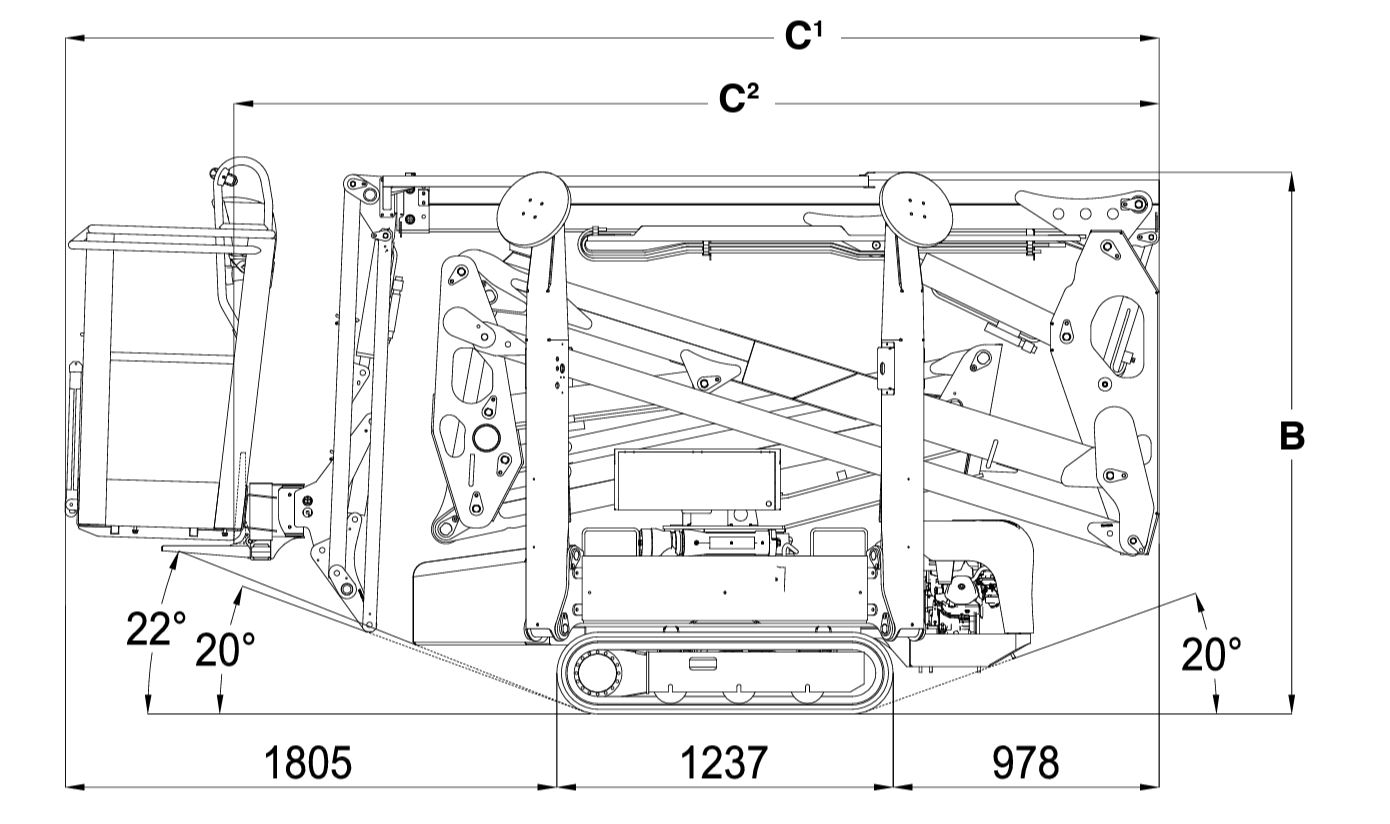 | Chiều dài xe khi thu gọn chưa gồm sàn nâng (Theo gầm bánh xích) (C2) | 3,4 m |